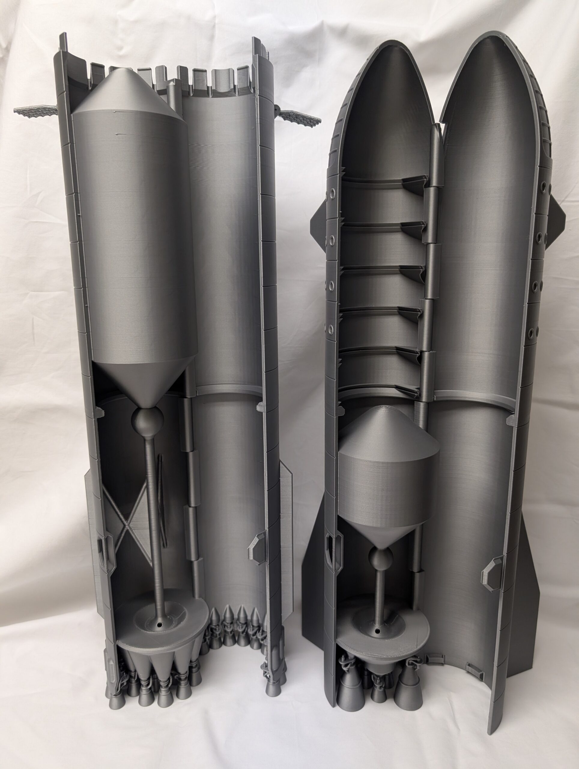 Introducing the Starship Heavy: This is the complete Starship and booster launch vehicle. The Starship assembles onto the heavy booster with snap-fit features. Both the rocket and the booster can open up together to show the complete cross-section of the vehicle including the liquid methane and oxygen tanks as well as the rocket engines.